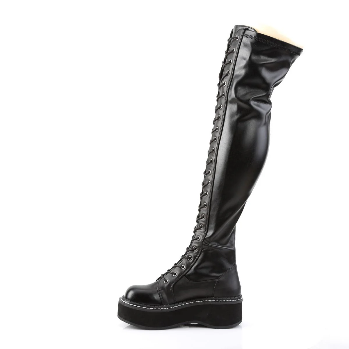 Demonia's Emily 375 is the unrivalled choice for a gothic thigh-high platform boot. Crafted from premium black vegan leather uppers with laces that span the entire boot you will turn heads wherever you go. The 2" thick rubber platform sole adds to the dominating presence of these boots. With a side metal zipper to make it easy to take the boot on and off, and the laces allowing you to perfectly adjust the boot to your leg, this boot excels in comfort, practicality and above all style. Whether you're seeking to make a statement or just want to express your personality, these shoes are unrivalled