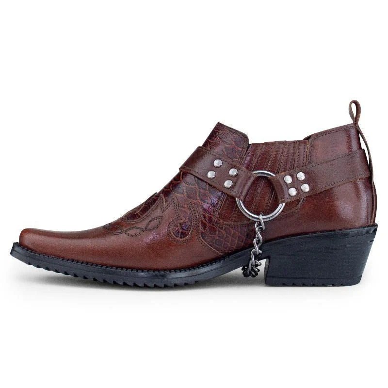 Embrace the timeless charm of the classic western look with these distinctive shoes. The winklepicker silhouette meets modern style through the addition of a stylish silver concho harness, making these shoes a standout choice.