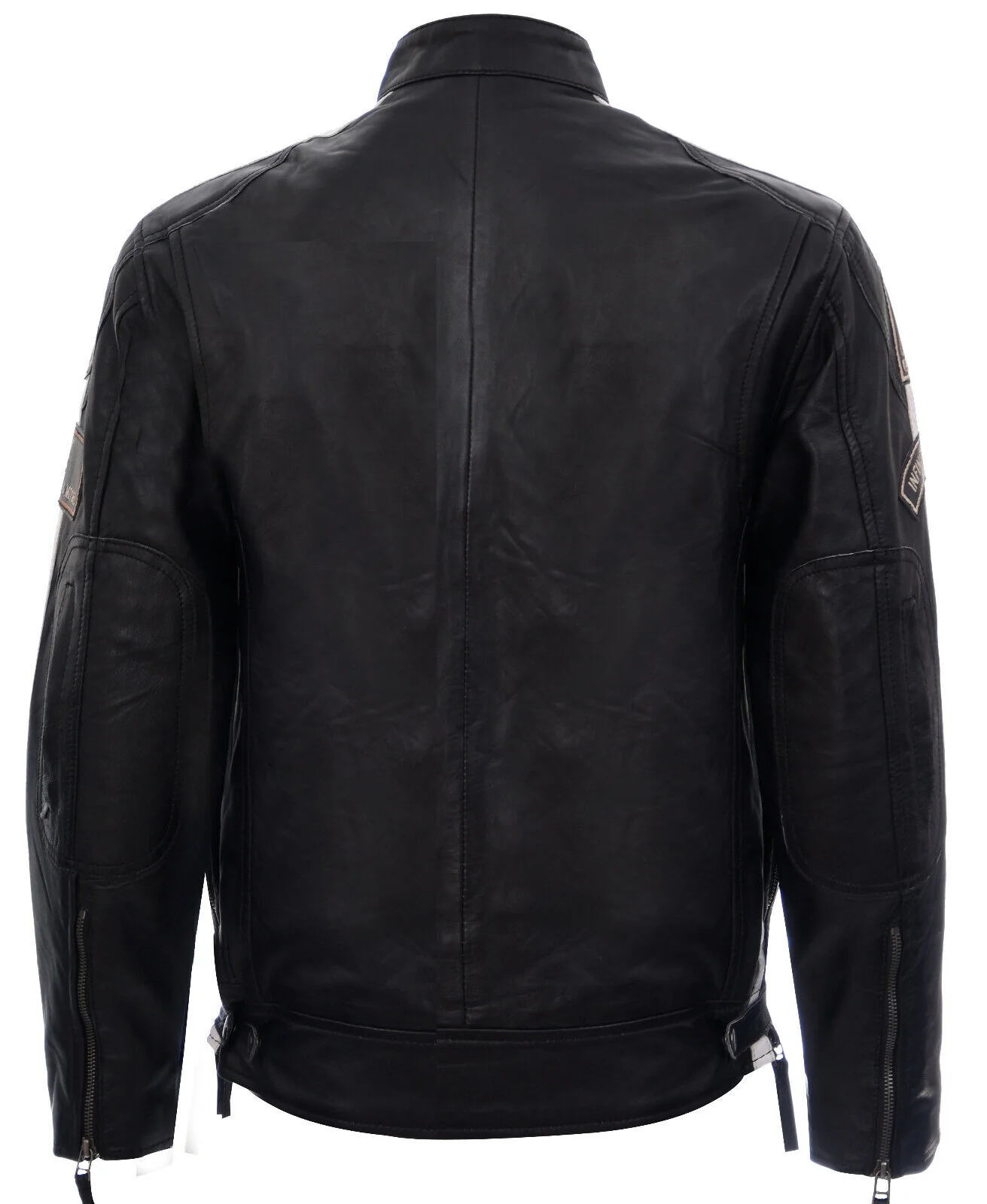 Imbued with a classic biker spirit, this modern classic jacket epitomizes the racing spirit with embroidered badges and contrasting twin stripes and is finished in a soft luxurious Nappa leather. For added practicality there are 2 zipped chest pockets, 2 pockets on the body. To help provide a more customised fit the waist can be adjusted. This garment is practical, durable and is suitable for any occassion and will be the perfect addition to your wardrobe.