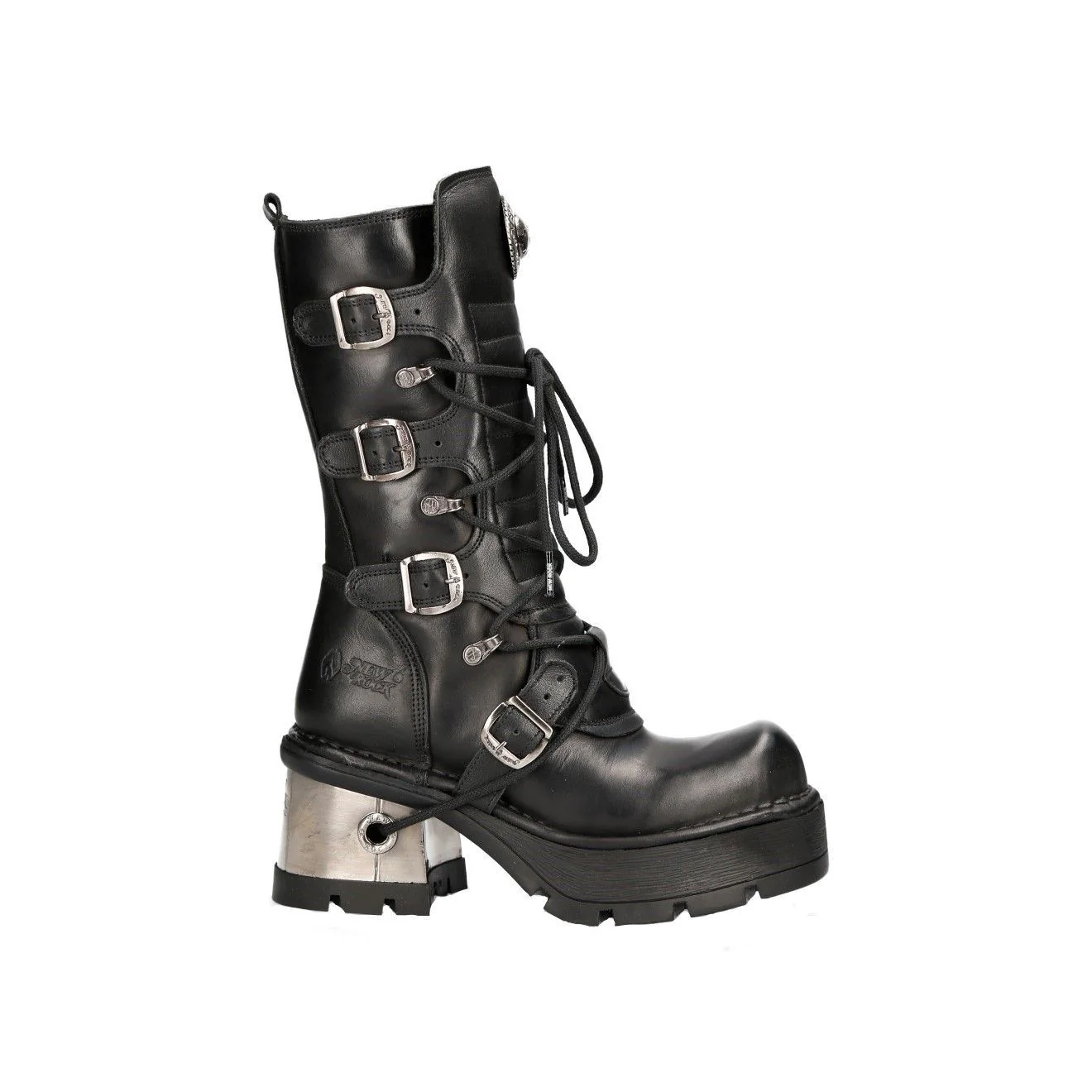 These genuine leather boots, part of New Rock’s iconic Metallic Series, feature black cowhide leather uppers and high-quality branded metal buckles that give the boots a contemporary and striking look.