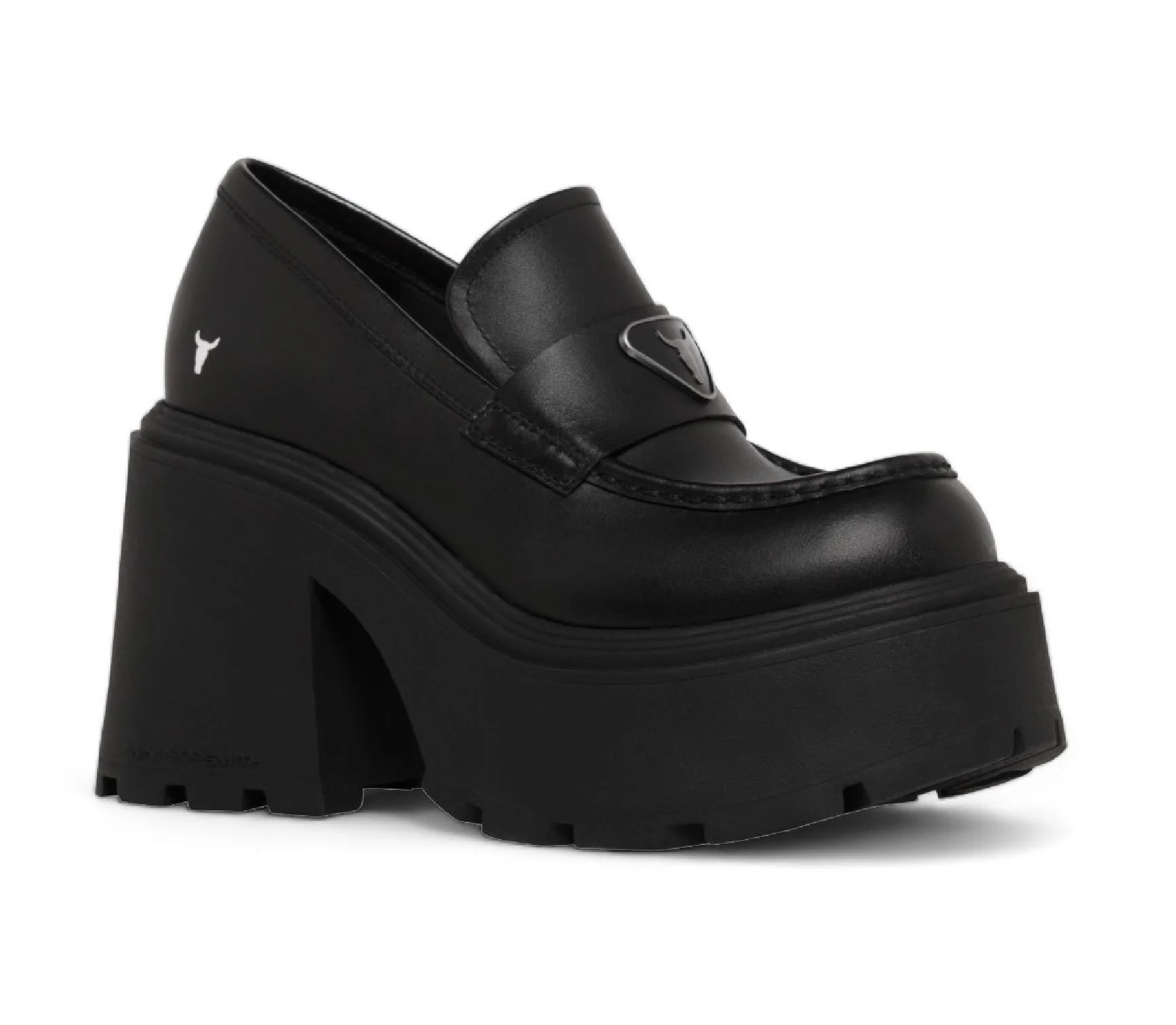 These chunky platform shoes bring boldness and style to your wardrobe. Adorned with the iconic Windsorsmith bull logo in metal detailing, they feature a loafer design with a modern twist. The lightweight cleated sole and high heel make these shoes a standout for confident, edgy looks.